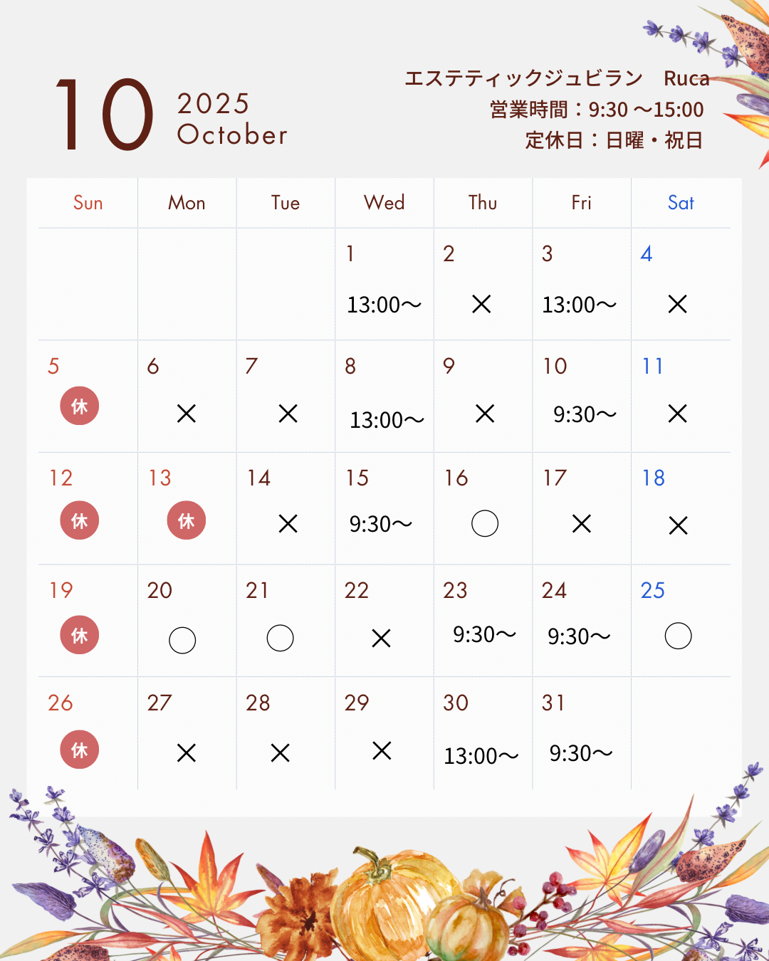 ご覧くださりありがとうございます🙏✨9/30現在の予約空き状況です💆◯のところはお好きな時間で予約可能です🙆皆様のご予約、ご来店を心よりお